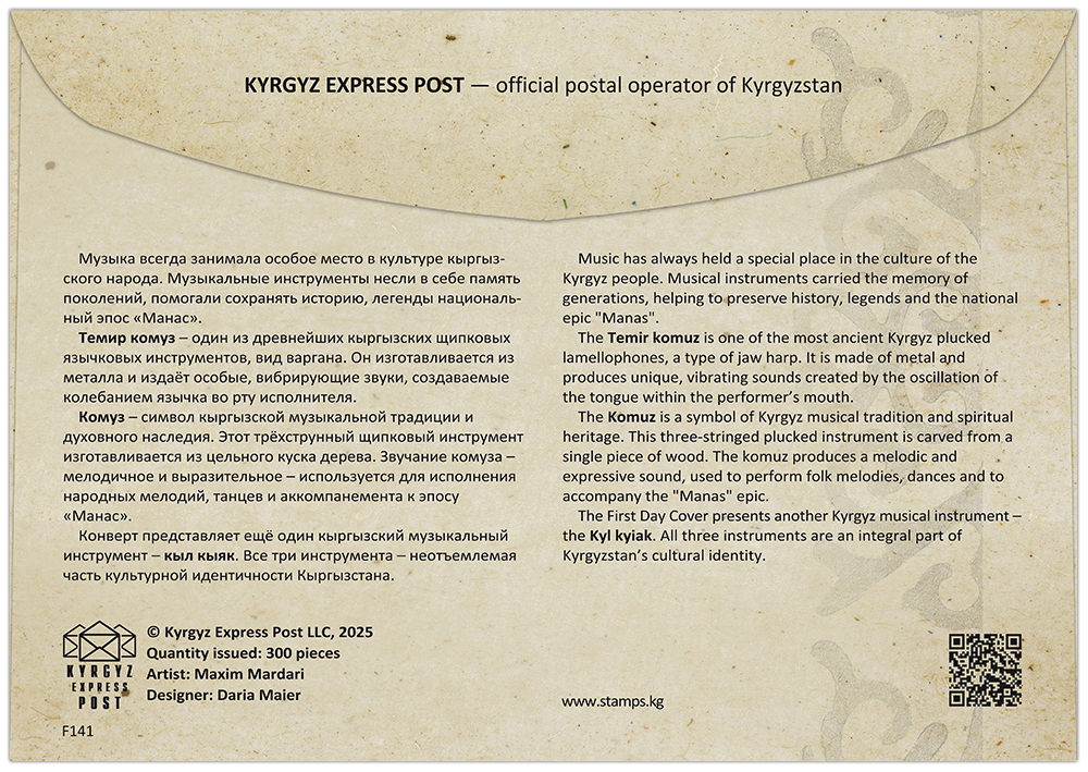 For this issue we made a first day cover. The stamps are affixed to a specially designed envelope and are cancelled with a special pictorial first day cancellation. The FDC presents Kyrgyz musical instrument – the Kyl kyiak.